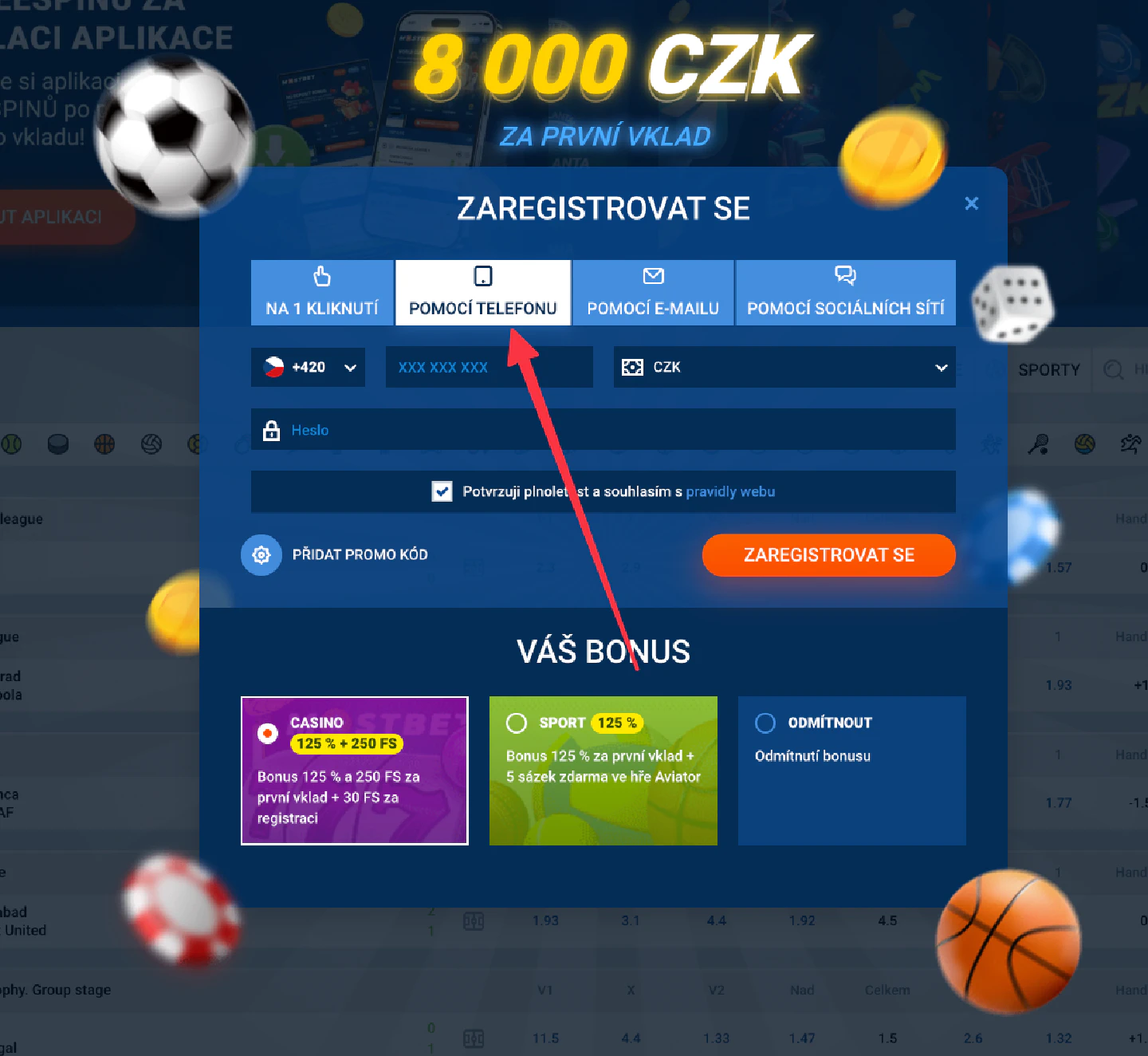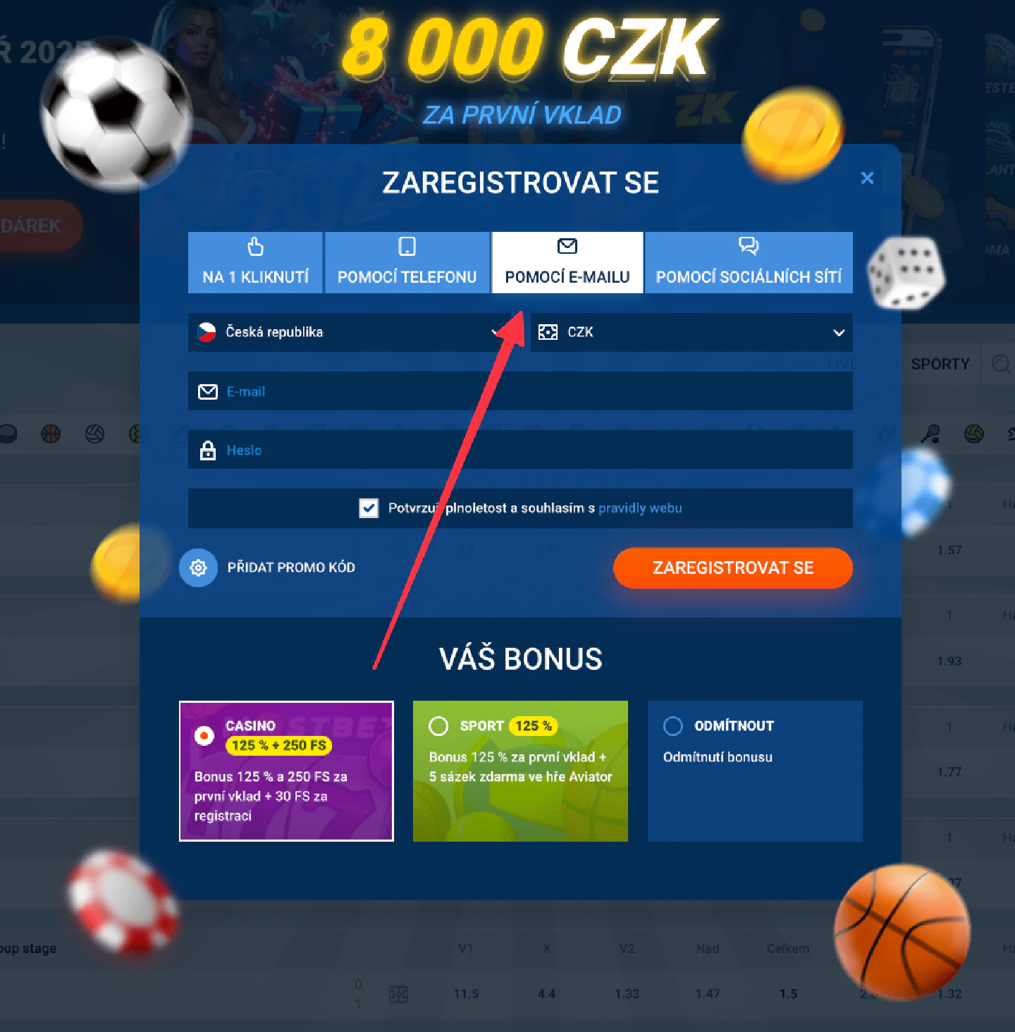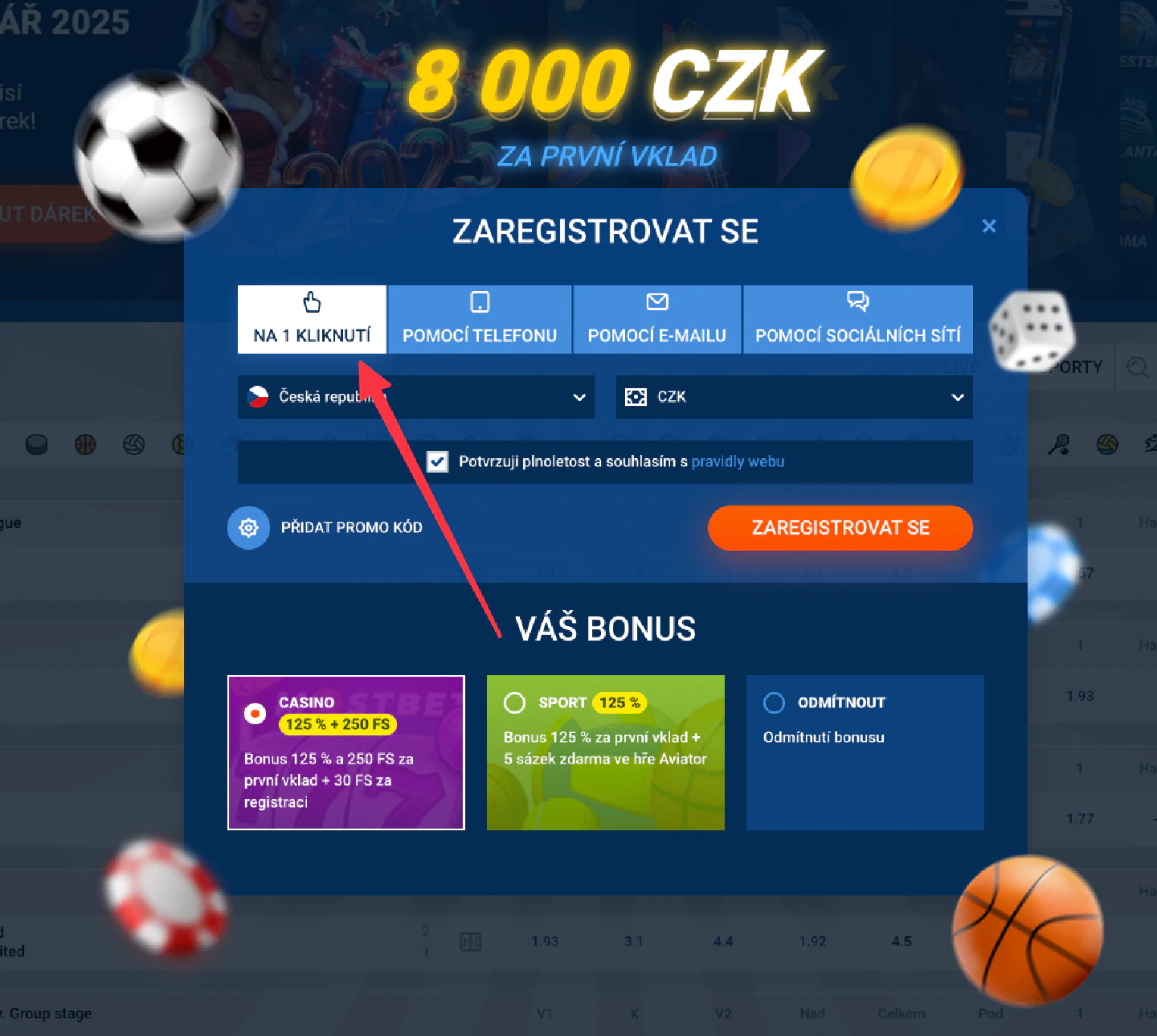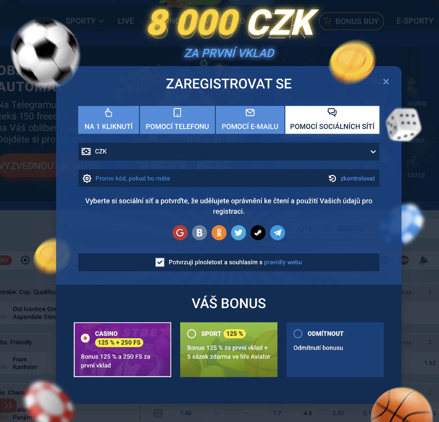 - Rozhodněte se, zda chcete využít uvítací bonus – máte na výběr bonus pro sportovní sázení nebo do kasina (případně ho můžete odmítnout).